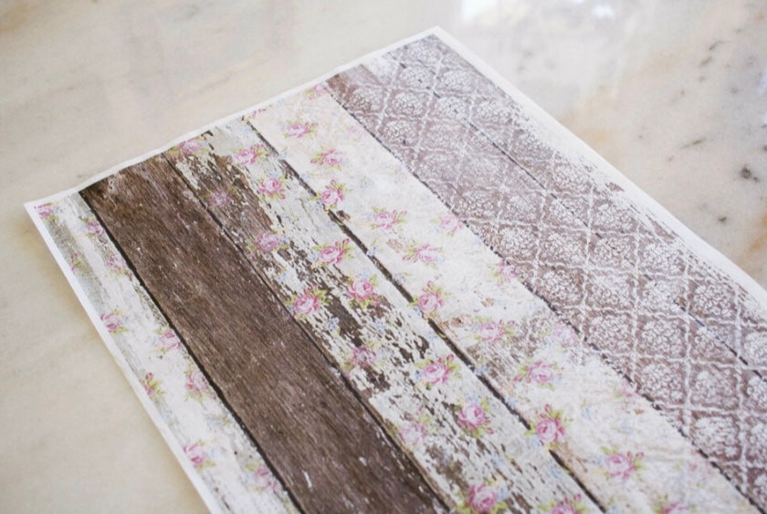 Distressed wood, the staple to a farmhouse style gets dolled up with spring flowers. Get creative with this rice decoupage paper.