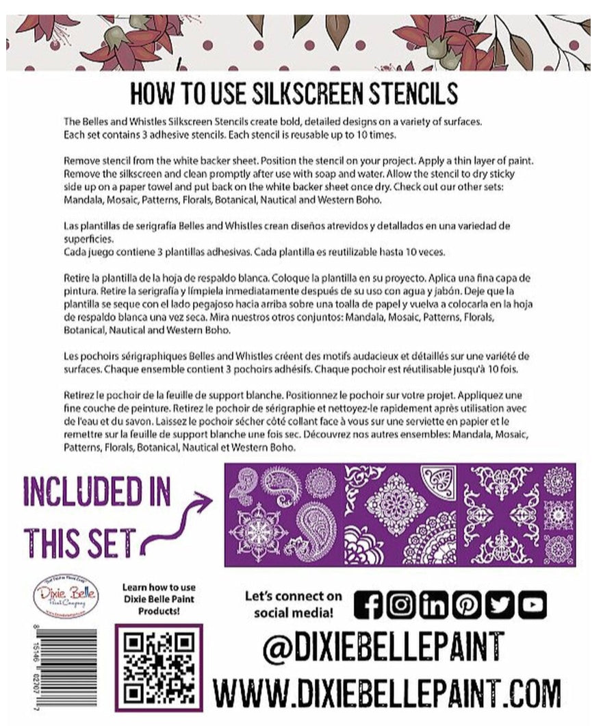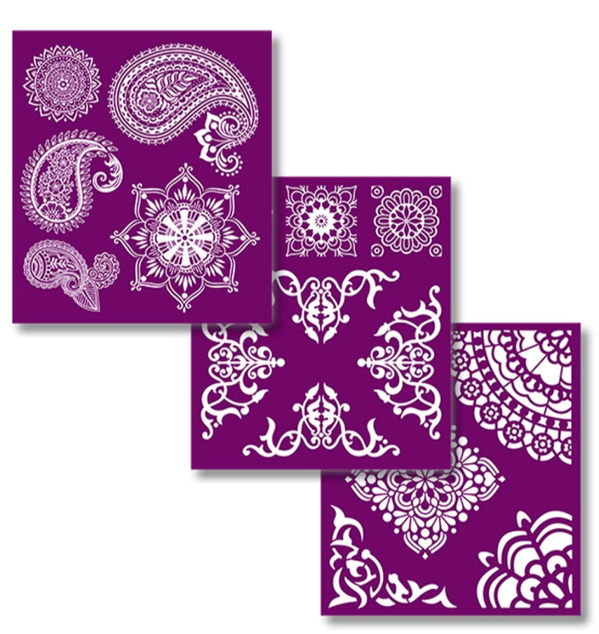 Each package contains THREE individual Silk Screen Stencils with assorted designs.